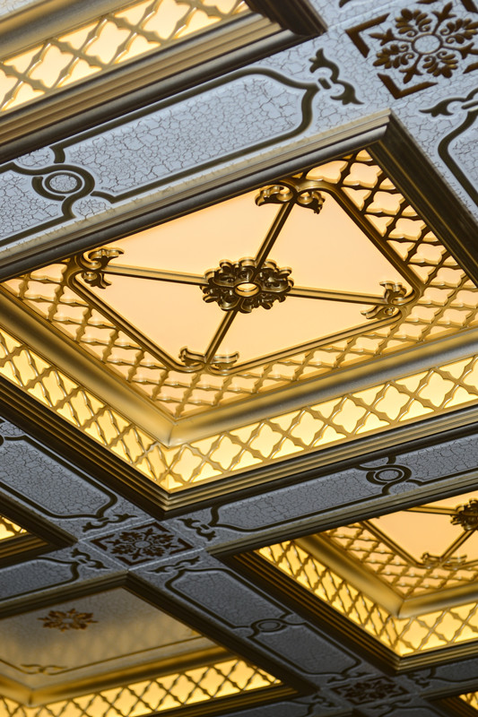 其設(shè)計(jì)理念來源于梵蒂岡的圣彼得大教堂穹窿頂,尤其是其巨大的圓形穹頂脊線有序排布的雕刻,錯(cuò)落排列的方格;而最核心的客廳頂產(chǎn)品設(shè)計(jì)理念則來源于米開朗基羅設(shè)計(jì)的雙重圓頂,在雕刻精美的吊頂板之下設(shè)計(jì)一圈鏤空的光帶,讓光線自由發(fā)散,用光線來烘托板面的精致細(xì)膩,營造如夢似幻的空間氛圍。并借鑒其井字結(jié)構(gòu)的裝飾方式,在天花吊頂領(lǐng)域引入腰線裝飾的概念,以腰線做架構(gòu),營造空間氣勢,突顯細(xì)節(jié)的精致與非凡的格調(diào)。
